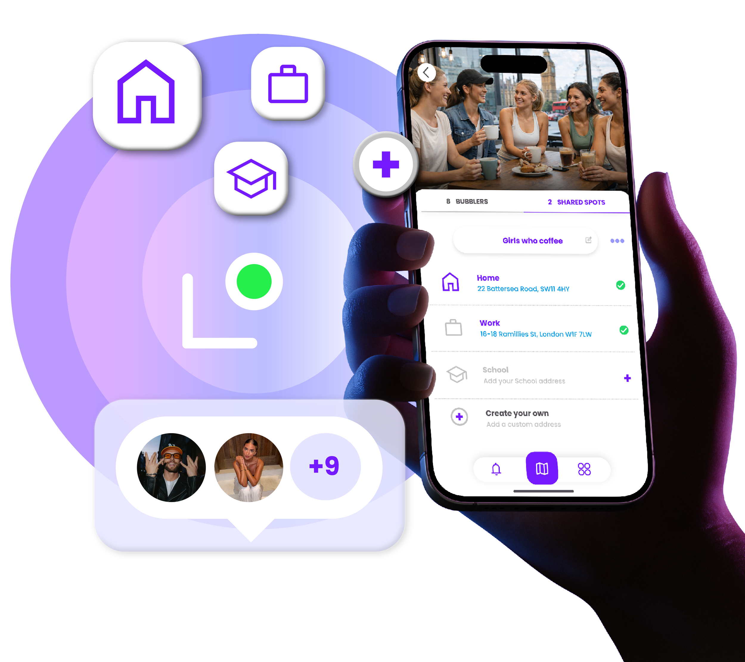 You can ghost all Bubbles or just the ones you choose. Whether it’s a work Bubble, a friends group, or a partner Bubble, you decide who can see you in real time. Turn it on or off whenever you like, your privacy is always in your control.